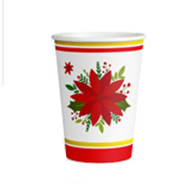 Bellissimi bicchieri bianchi decorati con il fiore di Natale e linee eleganti intorno alle estremità in oro metallizzato.