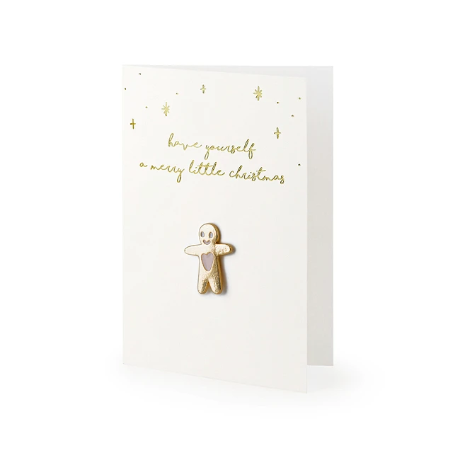 Un bel biglietto con cui augurare un Buon Natale. È decorato con una spilla metallica con un omino di pan di zenzero e comprende anche una busta per conservare il biglietto.