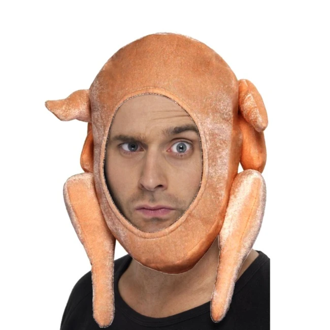 Questo prodotto è composto da una sorta di cappello-maschera color crema, le cui parti in morbido tessuto riproducono la forma di un tacchino ripieno, con le ali in alto e le cosce in basso.