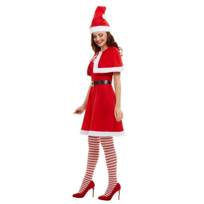 Questo prodotto è composto da un abito rosso con gonna, ornato da un bordo bianco sul petto e sul bordo della gonna, e da una cintura nera con una fibbia dorata cucita sopra. È completato da un corto mantello di estetica simile e da un tradizionale cappello da Babbo Natale.