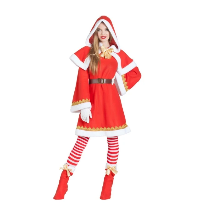 Si compone di un abito rosso di morbido tessuto con bordi bianchi e dettagli dorati. Il mantello con cappuccio segue lo stesso stile, si chiude con velcro nascosto dietro il fiocco dorato. Comprende anche una cintura per allacciare il vestito e i copriscarpe, che hanno un elastico sul fondo da attaccare alle scarpe.