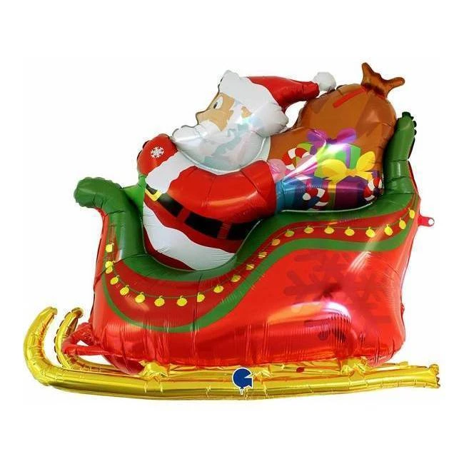 Impressionante palloncino tridimensionale con la silhouette di Babbo Natale con la sua slitta piena di regali.