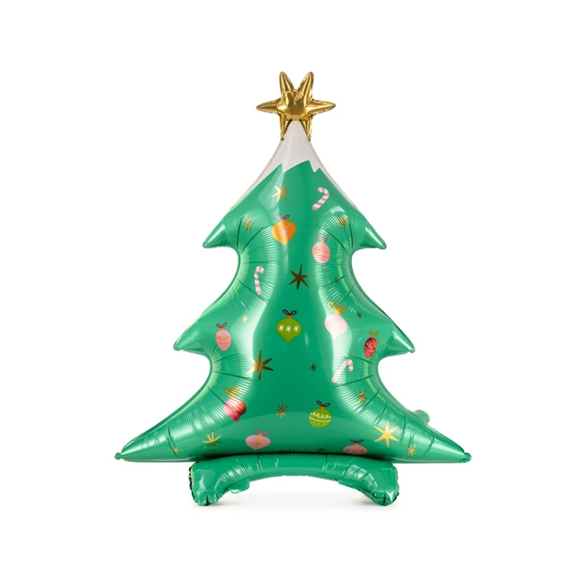 Bellissimo palloncino a forma di albero di Natale con ornamenti come palline, stelle e bastoncini di zucchero. Molto divertente per decorare le feste di Natale.