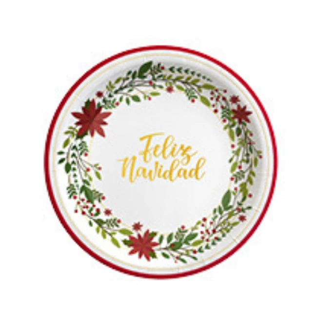 Confezione di piatti molto carini per Natale, pieni di foglie e fiori intorno ai bordi e al centro include una frase natalizia. Tutti i dettagli in oro hanno un effetto metallizzato.