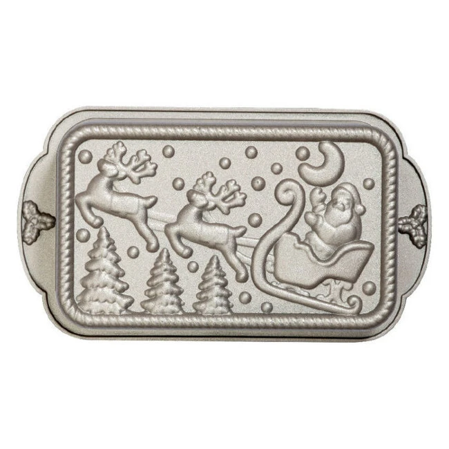 Quando si cuoce il pan di spagna con questo stampo, diverse forme natalizie appariranno in rilievo, il che vi renderà più facile decorare la torta in seguito. È di forma rettangolare e si distingue per le sue forme di Babbo Natale nella sua slitta trasportato dalle sue renne.