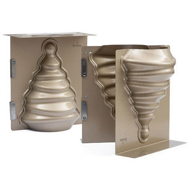 Con questo stampo in metallo puoi creare una figura tridimensionale di un fantastico albero di Natale. È composto da 2 parti che si uniscono per cuocerlo a testa in giù nel forno e mantenere la sua forma.