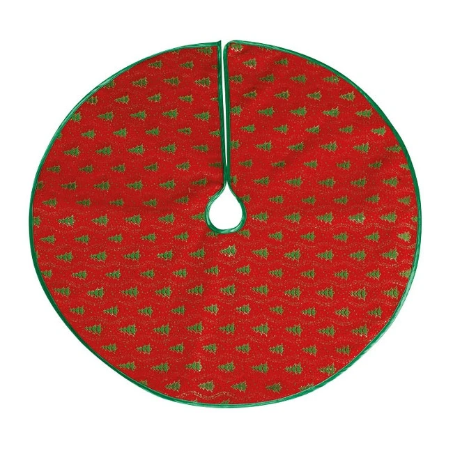 Si tratta di un cerchio rosso con un bordo verde con alberi di Natale verdi bordato di glitter dorati.