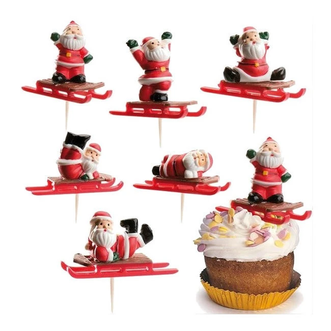 Topper per cupcake o torte con Babbo Natale in posizioni divertenti sulla sua slitta.